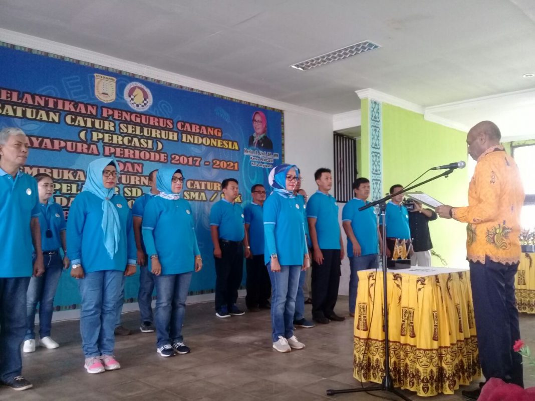 JAYAPURA (PT) – Ketua KONI Kota Jayapura yang juga Wali Kota Jayapura, DR. Benhur Tomi Mano, MM resmi melantik Ketua Persatuan Catur Seluruh Indonesia (Percasi) yang di ketuai Merlan Uloli di Aula SMPN 1 Jayapura, Sabtu (5/5/2018).