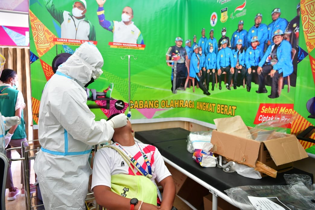 Untuk para atlet dan ofisial cabang olahraga (cabor) angkat berat, pemeriksaan antigen dilakukan di ruang medis venue cabor angkat berat di Suni Garden Lake Hotel dan Resort, Jayapura.