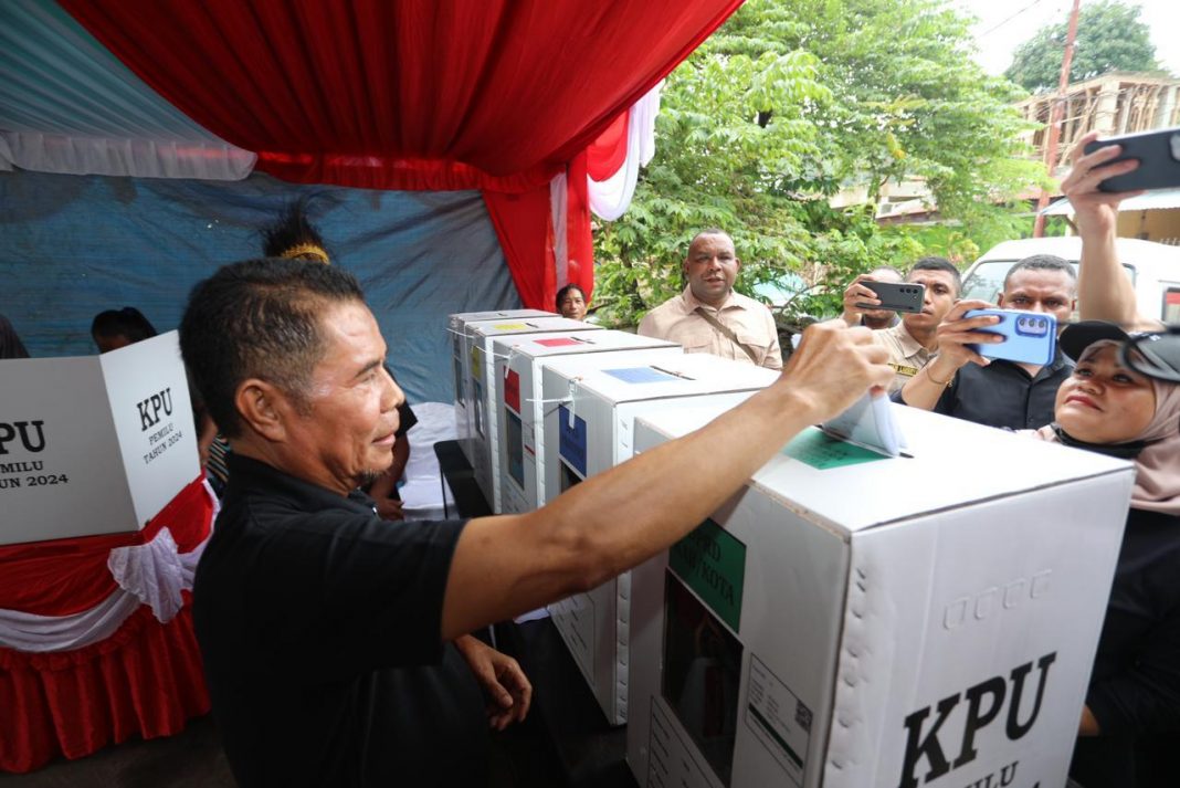 JAYAPURA (PT) – Penjabat Gubernur Papua, Ridwan Rumasukun menyalurkan hak pilihnya di Tempat Pemungutan Suara (TPS) 33 Perumnas, Waena Kota Jayapura, Rabu (14/2).
