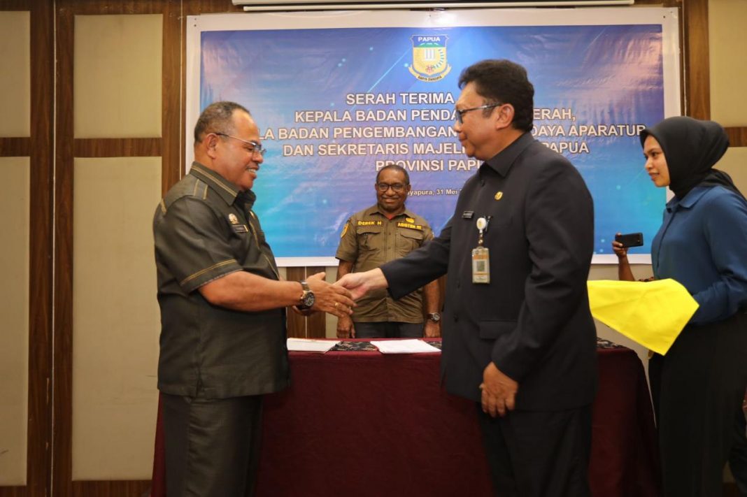 JAYAPURA (PT) – Pj. Sekretaris Daerah Papua, Derek Hegemur memimpin serah terima jabatan (sertijab) tiga kepala Organisasi Pimpinan Daerah (OPD) dilingkungan Pemerintah Provinsi Papua, Jumat (31/5) yakni dari Hans Hamadi kepada Matias Benoni Mano sebagai Plt Sekretaris Majelis Rakyat Papua baru, M.B. Setyo Wahyudi kepada Hans Hamadi sebagai Kepala Badan Pendapatan Daerah Papua dan Aryoko Rumaropen kepada Elsye Penina Rumbekwan sebagai Kepala Badan Pengembangan SDA Papua.