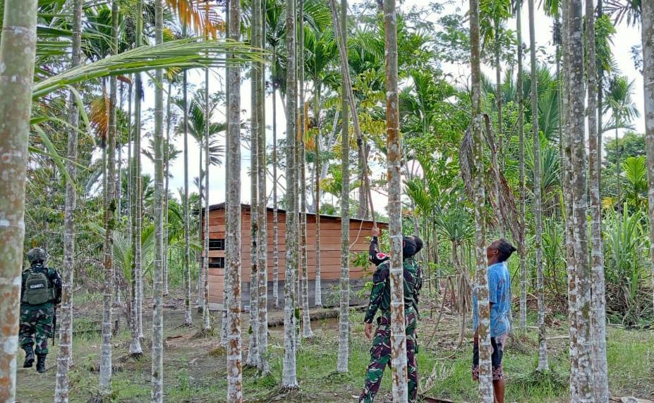 JAYAPURA (PT) — Wadansatgas Yonif 512/QY, Kapten Inf. Andri Putra Situmorang, SST. Han terjun langsung membantu masyarakat setempat panen buah pinang dari pohonnya. Kegiatan ini menjadi bagian dari upaya mendekatkan diri kepada masyarakat sekaligus memahami lebih dalam kearifan lokal yang masih lestari di Tanah Papua khususjya di Senggi, Kabupaten Keerom, Provinsi Papua, Kamis, (3/10).