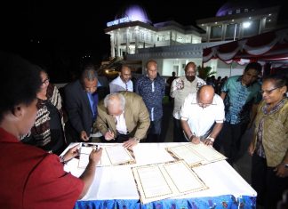 JAYAPURA (PT) - Gubernur Provinsi Papua, Lukas Enembe, SIP, MH dan Gubernur Provinsi Madang di Papua New Guinea (PNG), Pete Yama secara resmi menandatangani MoU kerjasama provinsi bersaudara, Minggu (21/10/2018) malam di Gedung Negara.