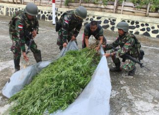 JAYAPURA (PT) - Untuk kedua kalinya anggota Satuan Tugas Pengamanan Perbatasan (Satgas Pamtas) Yonif 121/MK berhasil menemukan ladang ganja seluas setengah heltar di Kampung Kalilapar, Distrik Waris, Kabupaten Keerom Papua, Senin (24/4/2018).