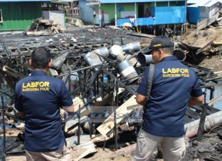 JAYAPURA (PT) – Tim forensik Mabes Polri dibackup Reskrim Polda Papua melakukan olah Tempat Kejadian Perkara (TKP) kasus pembakaran rumah sakit dan fasilitas umum di Kampung Banti, Tembagapura, Kabupaten Mimika, Rabu (4/4/2018).