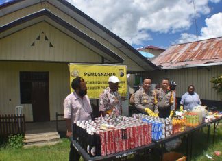 TOLIKARA (PT) - Dalam rangka meningkatkan keamanan dan ketertiban di wilayah hukum Polres Tolikara Tolikara, maka puluhan botol minuman lokal (Milo) yang berhasil disita kemudian dimusnahkan.