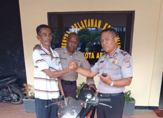 JAYAPURA(PT) - Anggota Kepolisian Sektor Abepura berhasil mengembalikan satu unit motor yang diduga hilang akibat dicuri oleh orang tak dikenal kepada pemiliknya di halaman Polsek Abepura, Selasa (24/4/2018) siang.