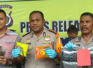 JAYAPURA (PT) - MW (42) warga Distrik Jayapura Utara dan KM (21) warga Distrik Jayapura Selatan tak berkutik saat polisi berhasil mengamankan barang bukti berupa daun ganja kering seberat 1,5 kilogram dari barang bawaan mereka di Pelabuhan Jayapura, Senin...