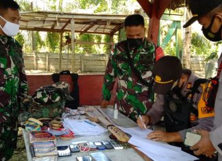 Aparat kepolisian dari Polres Keerom bersama Satgas Pamtas saat mengidentifikasi barang bukti.