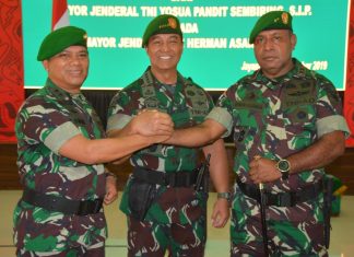 JAYAPURA (PT) – Tongkat kepemimpinan Pangdam XVII/Cenderawasih yang sebelumnya dipegang oleh Mayjen TNI. Yosua Pandit Sembiring, kini diserahkan ke Mayjen TNI. Herman Asaribab yang merupakan putra asli Papua.