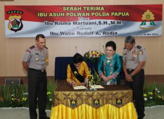 JAYAPURA (PT) – Ibu asuh Polwan Polda Papau diserahterimakan dari Ibu Risma Martuani Sormin, MSi kepada Ibu Watie Rudolf A. Rodja, yang berlangsung di Aula Rastra Samara, Mapolda Papua, Sabtu, 4 Mei 2019.
