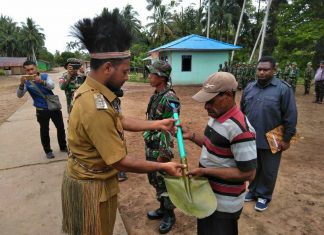 JAYAPURA (PT) - Bupati Mappi, Cristosimus Y. Agawemu secara resmi membuka kegiatan TNI Manunggal Membangun Desa (TMMD) ke 103 Kodim 1707/Merauke di Kampung Bifo, Distrik Passue Bawah, Kabupaten Mappi, Kamis (18/10).