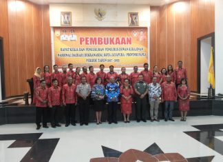 JAYAPURA (PT) - Kepengurusan Dewan Kerajinan Nasional Daerah (Dekranasda) Kota Jayapura periode 2017 - 2022 dibawah pimpinan Chritine RI Luluporo secara resmi dikukuhkan di Aula Sian Soor, Kantor Wali Kota Jayapura, Jumat (14/9).
