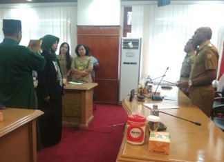 JAYAPURA (PT) - Wali Kota Jayapura, DR. Benhur Tomi Mano, MM resmi melantik dr. Titis Rinjayatri sebagai Kepala Puskesmas Kotaraja menggantikan dr. Masdiana Pardede, Senin (3/9/2018) diruang Wali Kota.