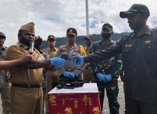 PUNCAK JAYA (PT) - Untuk kedua kalinya dalam kepemimpinan Bupati Puncak Jaya, Yuni Wonda, S.Sos, S.IP, MM dilapangan terbuka dengan kesadaran diri sendiri masyarakat menyerahkan sepucuk senjata api merek Bareta kepada negara.