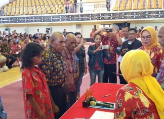 JAYAPURA (PT) - Sebanyak 225 pasangan suami istri nikah massal yang digelar oleh Dinas Kependudukan dan Catatan Sipil (Disdukcapil) Kota Jayapura di GOR Cenderawasih, Sabtu (2/3).