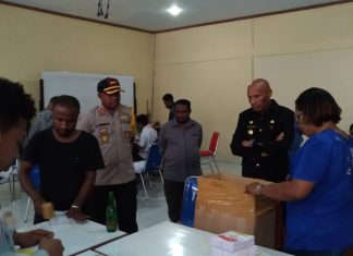 JAYAPURA (PT) - Kapolres Jayapura Kota AKBP Gustav R. Urbinas, SH, SIK saat mendampingi Walikota Jayapura DR. Drs. Benhur Tomi Mano, MM meninjau langsung pelipatan surat suara Pemilu Presiden dan Legislatif Tahun 2019 bertempat di Kantor Badan Sumber Daya...