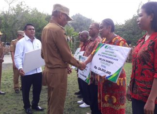 JAYAPURA (PT) - Wali Kota Jayapura, Dr. Benhur Tomi Mano, MM menyerahkan santunan kematian dari Badan Penyelenggara Jaminan Sosial (BPJS) Ketengakerjaan kepada 5 ahli waris senilai Rp 24 juta per orang.