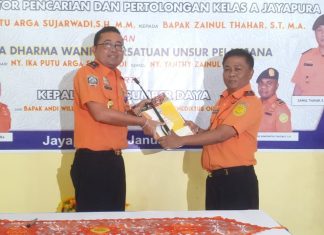 SENTANI (PT) - Jabatan Kepala Kantor Pencarian dan Pertolongan Kelas A Jayapura, diserahterimakan dari Putu Arga Sujarwadi kepada Zainul Tahhar, bertempat di Aula Kantor Pencarian dan Pertolongan Kelas A Jayapura, Senin (20/01).