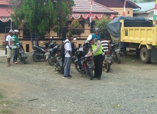 SENTANI (PT) - Anggota Unit Lantas Polsek Sentani Timur yang dipimpin langsung oleh Kanit Lantas Polsek Sentani Timur, Bripka Daniel Tapilatu menggelar razia kendaraan bermotor roda dua di depan Mapolsek Sentani Timur, Rabu, (31/7).