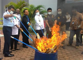 SENTANI (PT) - Badan Narkotika Nasional (BNN) Kabupaten Jayapura melakukan pemusnahan narkotika jenis ganja dan Pil Paracetamol Caffeine Carisoprodol (PCC) golongan satu serta mengamankan seorang tersangka berinisial IS (34).