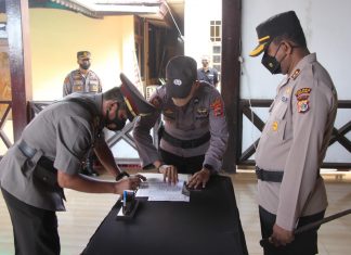 SENTANI (PT) – Kapolres Jayapura, AKBP. Fredrickus W.A Maclarimboen, S.IK, MH memimpin upacara serahterima jabatan Waka dan Kabag Ops di Obhe Reay May Polres Jayapura, Rabu, (8/6).
