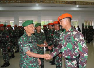JAYAPURA (PT) - Panglima Kodam XVII/Cenderawasih Mayjen TNI Yosua Pandit Sembiring, SIP, diwakili Irdam XVII/Cenderawasih Kolonel Inf Joko Hadi Susilo memimpin upacara penerimaan dan pelepasan Satgas Paskhas TNI AU BKO Kodam XVII/Cenderawasih di lapangan Frans Kaisiepo Makodam XVII/Cenderawasih, Selasa...