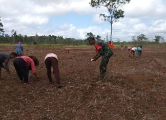 JAYAPURA (PT) - Babinsa Koramil 1707-05/Merauke Serda Yudha Sapta Hadi membantu masyarakat petani Kampung Yemunain Jaya, Distrik Jagebob, Kabupaten Merauke menanam padi dengan sistem TOT (Tanpa Olah Tanah), Kamis (22/11).