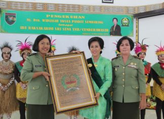 JAYAPURA (PT) - Pangdam XVII/Cenderawasih Mayjen TNI Yosua Pandit Sembiring, SIP menghadiri pengukuhan, Ny. Dra. Widiasih Yosua Pandit Sembiring sebagai Ibu Raksakarini Sri Sena XVII/Cenderawasih bertempat di Aula Tonny A Rompis Makodam XVII/Cenderawasih, Rabu (14/11).
