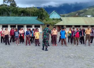 JAYAPURA (PT) - Anggota Pramuka Saka Wira Kartika Binaan Kodim 1714/Puncak Jaya yang berjumlah 50 orang menerima pelajaran baris berbaris dari anggota Kodim 1714/PJ bersama tim pembinaan masyarakat TNI di lapangan upacara SMPN 1 Muliam, Kampung Perleme, Distrik Mulia,...