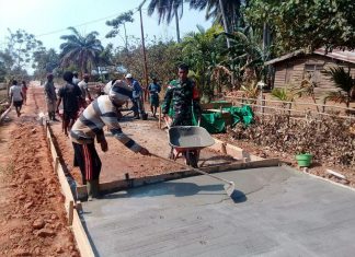 JAYAPURA (PT) - Bintara Pembina Desa atau Babinsa Koramil 1707-05/Merauke Serda Riyanto berupaya membantu masyarakat dalam melakukan pengecoran jalan di jalur Rt03 menuju Rt04 Kampung Domande, Distrik Malind, Kabupaten Merauke, Rabu (19/9).