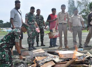 JAYAPURA (PT) - Satgas Yonif Para Raider 501/Kostrad bersama Balai Karantina Jayapura melaksanakan pemusnahan kulit buaya ilegal yang dilakukan di Pos Komando Taktis (Kotis) Satgas Yonif Para Raider 501/Kostrad, Skouw, Distrik Muara Tami, Jayapura, Rabu (01/8/2018).