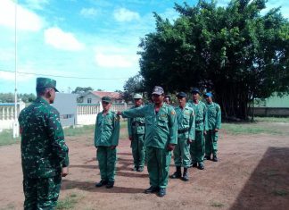 JAYAPURA (PT) - Bintara Pembina Desa (Babinsa) Komando Rayon Militer (Koramil) 1707-05/Merauke, Sertu. Adi Sutrisno memberikan pelatihan baris-berbaris kepada Pelindung Masyarakat (Linmas) Kampung Padang Raharja di Balai Kampung Padang Raharja, Distrik Malind, Kabupaten Merauke, Selasa (24/7/2018).