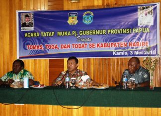 NABIRE (PT) - Penjabat Gubernur Papua, Soedarmo melakukan tatap muka dengan sejumlah tokoh agama dan tokoh adat Se-Kabupaten Nabire di Aula Kantor Bupati Nabire, Kamis (3/5/2018).