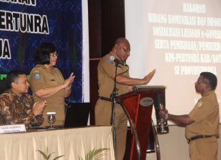 JAYAPURA (PT) – Penjabat Gubernur Papua, Soedarmo dalam sambutan tertulisnya yang dibacakan Asisten Bidang Umum Sekda Papua, Elysa Auri, SE, MM meminta seluruh Kabupaten/Kota di Papua diminta mempercepat pelaksanaan pembangunan Teknologi Informasi dan Komunikasi (TIK), khususnya penyediaan layanan kepada...