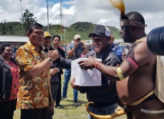 OKSIBIL (PT) - Guna menindaklanjuti masalah yang terjadi di Oksibil, Kabupaten Pegunungan Bintang dimana terjadi kericuhan yang mengakibatkan rumah dinas pribadi Bupati Pegunungan Bintang dibakar oleh masyarakat, Penjabat Gubernur Papua, Soedarmo langsung menemui masyarakat dan melakukan dialog, Jumat (20/4/2018).