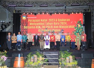 JAYAPURA (PT) - Perayaan Natal 2023 dan syukuran menyambut 2024 Pemerintah Provinsi Papua, dihadiri ribuan ASN, TNI/Polri dan masyarakat setempat. Ibadah berlangsung di Istora Papua Bangkit, Kabupaten Jayapura, Kamis (14/12).