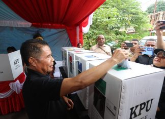 JAYAPURA (PT) – Penjabat Gubernur Papua, Ridwan Rumasukun menyalurkan hak pilihnya di Tempat Pemungutan Suara (TPS) 33 Perumnas, Waena Kota Jayapura, Rabu (14/2).