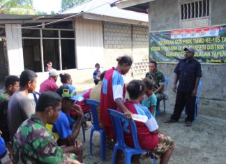 SERUI (PT) - Sertu Kamil selaku Tim Kesehatan yang tergabung dalam Satgas Tentara Manunggal Masuk Desa (TMMD) ke 105 Kodim 1709/Yawa, memberikan penyuluhan kesehatan kepada warga Kampung Mansesi, sebagai salah satu kegiatan non fisik TMMD, Rabu, 31 Juli 2019.