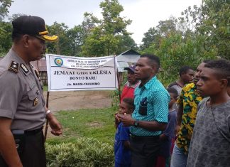 JAYAPURA (PT) - Satgas Binmas Noken Polri mengunjungi jemaat Gereja Injili Di Indonesia (GIDI) Eklesia, Kampung Bonto Baru, Distrik Dekai, Kabupaten Yahukimo, sekaligus memberikan bantuan material untuk pembangunan gedung gereja itu, Rabu (28/11).