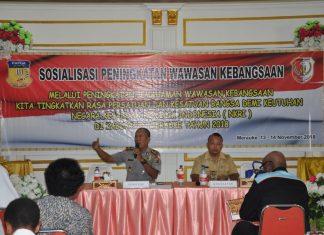 JAYAPURA (PT) - Kapolres Merauke, AKBP Bahara Marpaung, SH melalui Kasat Binmas Polres Merauke AKP Suryadi memberikan sosialisasi peningkatan wawasan kebangsaan bertempat di Gedung Belafiesta, Merauke, Rabu (14/11).