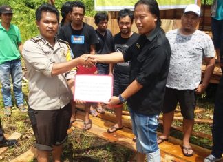 JAYAPURA (PT) - Bhabinkamtibmas Kampung Naramben Bripda Dwi Prasetyo bersama warga kerja bakti gotong royong membuat pondasi rumah kediaman warga setempat, yakni Trisantoso yang berada di Jalur II Kampung Naramben, Distrik Skanto, Kabupaten Keerom, Rabu (14/11).