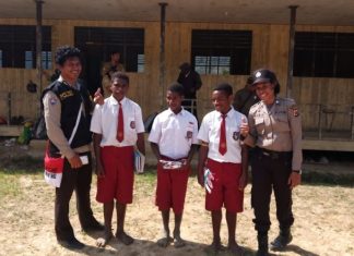 JAYAPURA (PT) - Setiap anak bangsa berhak mendapatkan pendidikan yang layak, kalimat inilah yang membuat personil Binmas Noken Polres Pegunungan Bintang, Briptu Eduard Habibu dan Anggota Sat Lantas Polres Pegunungan Bintang, Briptu Treslinda A menggandeng anggota TNI dan IPDN...