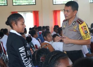 JAYAPURA (PT) - Kepala Kepolisian Resor Kepulauan Yapen, AKBP Penri Herison didampingi, Kasat Binmas Polres Kepulauan Yapen, AKP YG Kustur dan Kapolsek Angkaisera, Iptu Wayan Sukandia melaksanakan kegiatan Polisi Pi Ajar di Sekolah Menengah Kejuruan (SMK) Negeri 1 Kainui,...