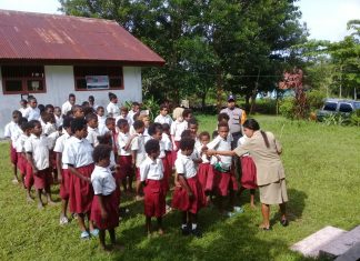 JAYAPURA (PT) - Kanit Binmas Polsek Waris Bripka Achmad, SH menyambangi SD Epinosa Kampung Kali Mo Distrik Waris Kabupaten Keerom dan membimbing siswa-siswi dalam belajar, Rabu (12/9/2018).