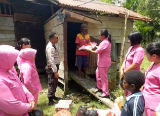 JAYAPURA (PT) - Personel Polsek Mimika Baru beserta Bhayangkari dipimpin Kapolsek Mimika Baru AKP P Ida Waymramra SE, SIK yang diwakili Waka Polsek Iptu Yulius Harikatang memberikan bantuan kasih berupa sembako dan pakaian layak pakai kepada keluarga Andreas Tenbak...