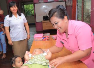 Dalam kegiatan ini, pengurus Bhayangkari Cabang Asmat membantu untuk menimbang anak-anak bayi dan...