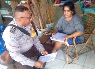 JAYAPURA (PT) - Kepolisian Sektor (Polsek) Sentani Kota dalam hal ini Bhabinkamtibmas Polsek Sentani Kota, Bripka. Engel Mayor melakukan giat sambangi ke warga pasar lama dan rumah Ketua RT Jalan Pasar Lama Kelurahan Hinekombe, Sabtu (18/8/2018)