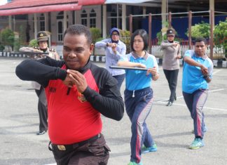JAYAPURA (PT) - Puluhan Polisi Wanita (Polwan) Polda Papua melaksanakan latihan senam borgol di Lapangan Apel Mapolda Papua, Selasa (21/8/2018).