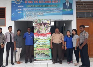 JAYAPURA (PT) - Kasat Binmas Polres Keerom, AKP. Mujiat, SH selaku Tim Satgas Pencehagan Saber Pungli Keerom bersama beberapa personilnya menggelar sosialisasi Saber Pungli pada siswa SMK Betlehem Arso I, Distrik Arso, Kabupaten Keerom, Jumat (3/8/2018).