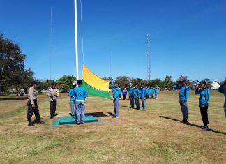 Kapolsek Okaba bersama anggota Bhabinkamtibmas melaksanakan pelatihan Paskibra di halaman Mapolsek Okaba.